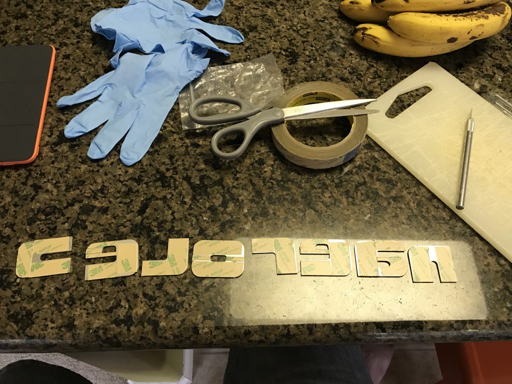 Again, drama struck – I tried about 10 different kinds of mounting tape and transfer adhesives before I finally found one that was thin enough to keep the letters from sticking out, but thick enough to compensate for the slight curve in the plastic bumper.